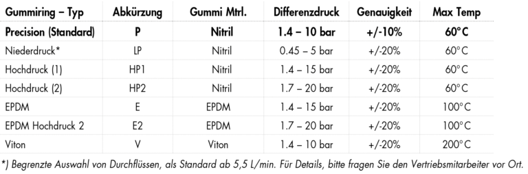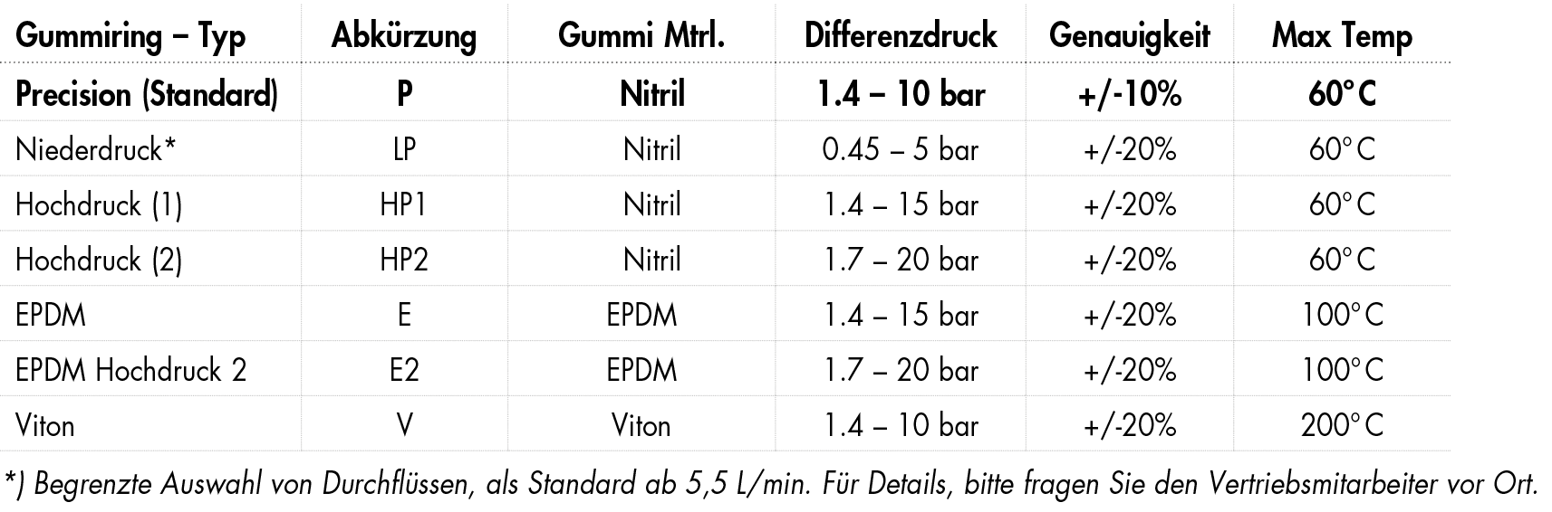 Mit unserem Standard-Gummiring-Typ PRECISION erreichen wir eine Durchflussgenauigkeit von ±10 % des Nennwerts. PRECISION ist für Druckabfälle zwischen 1,4 und 10 bar ausgelegt. Andere Druckbereiche sind auf Anfrage erhältlich.