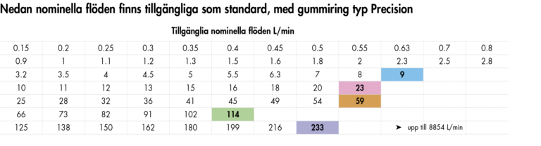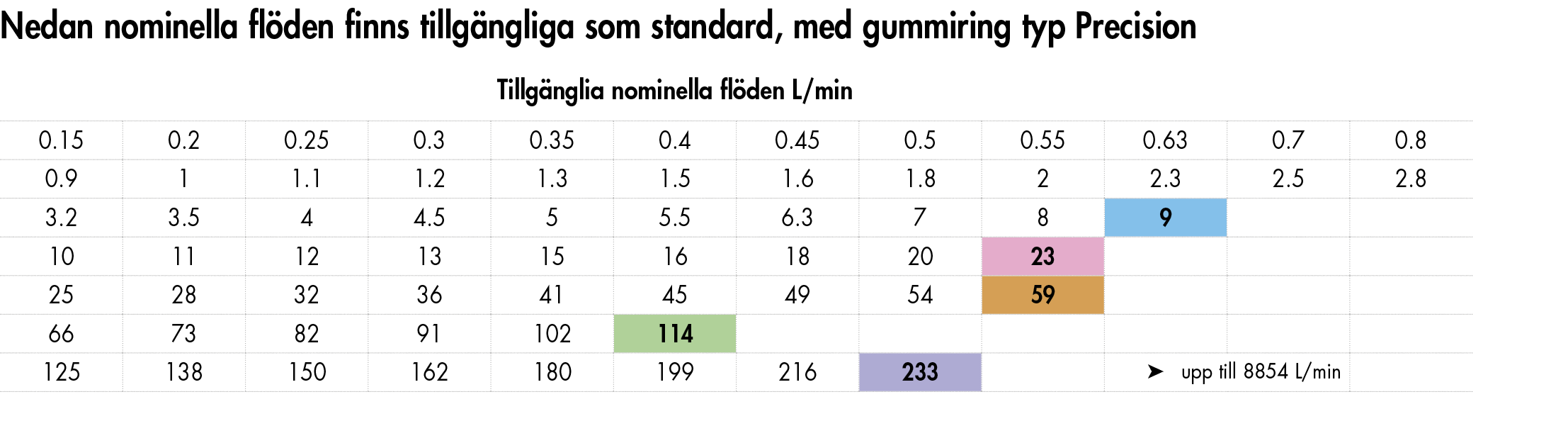 Med vår standardtyp av gummiring, Precision, uppnår vi en flödesnoggrannhet på ±10% av det nominella flödet. Precision är konstruerad för tryckfall mellan 1,4 och 10 bar. Andra tryckfallsintervall är tillgängliga på begäran.